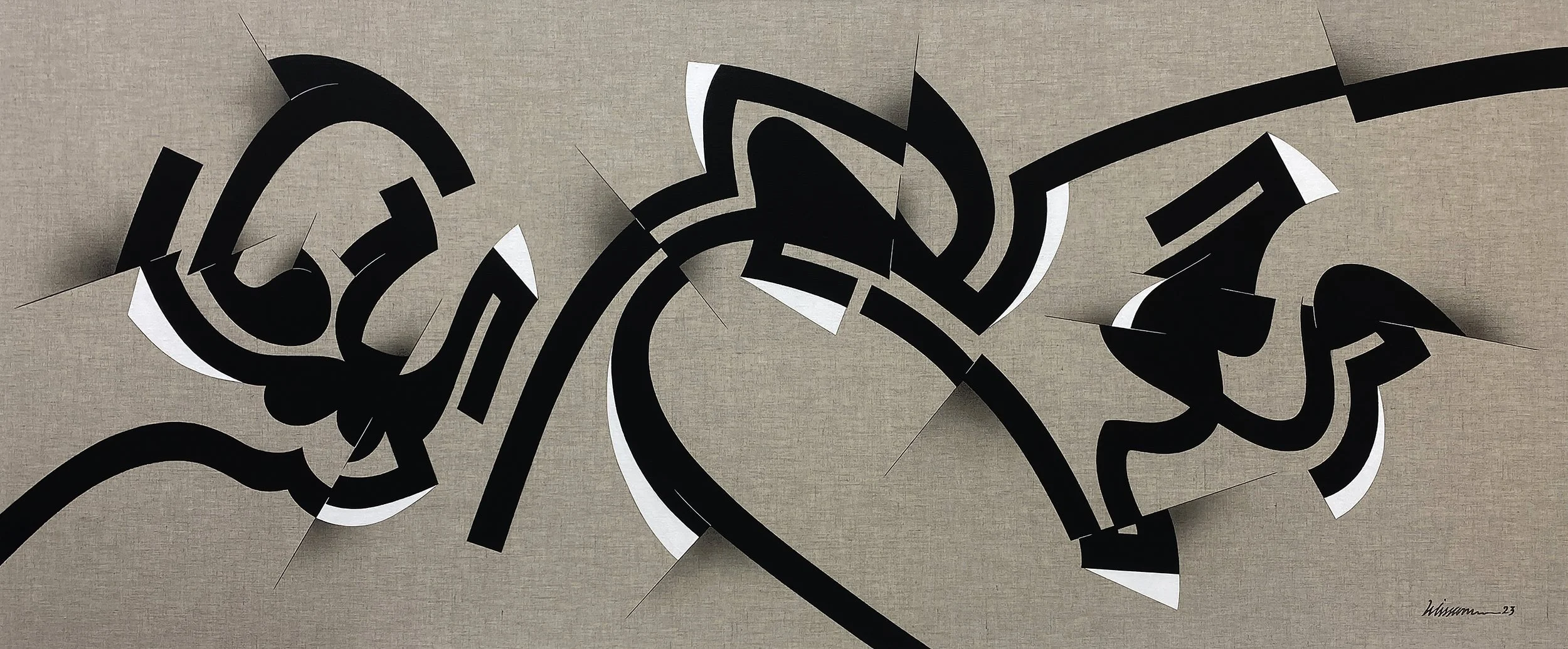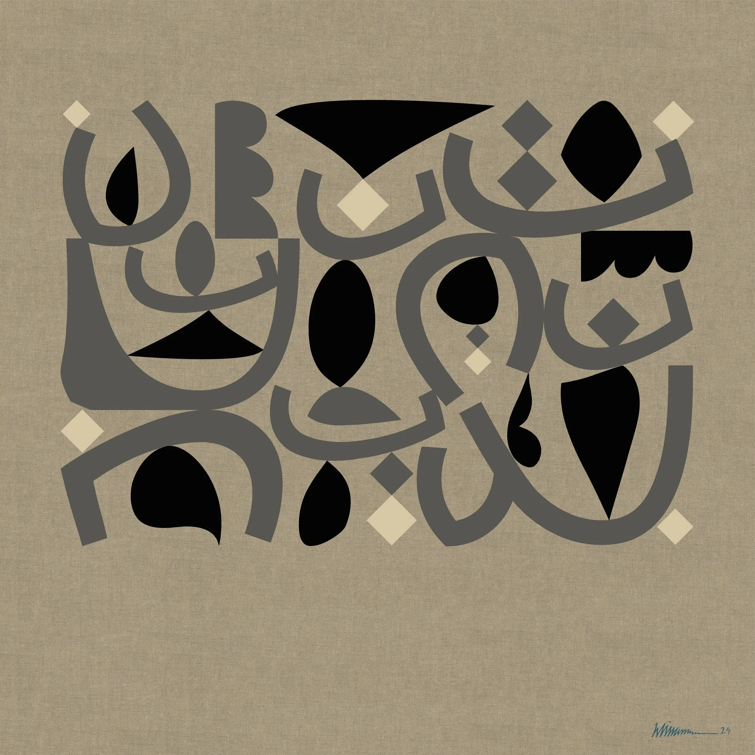 Although it may have initially come to me by meditating upon a letter, the ultimate shape is a monumental form that is not exclusively anchored in the Arab world. I am moved as much by old Turkish masters as I am by the Bauhaus, Geometric Abstraction, Futurism, Cubism, and Cecil Touchon’s collages. Beginning with this new body of work, I have chosen to refer to my style and approach as Calligraform. This refers to the emphasis on the forms of the letters, their inner and outer spaces and graphic quality, investigated in tandem with the precise shapes of calligraphic characters.”
